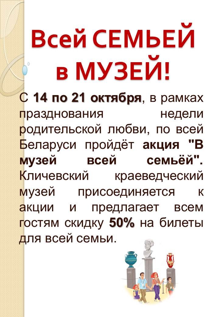 С 14 по 21 октября, в рамках празднования недели родительской любви, по всей Беларуси пройдёт акция "В музей всей семьёй". Кличевский краеведческий музей присоединяется к акции и предлагает всем гостям скидку 50% на билеты для всей семьи.